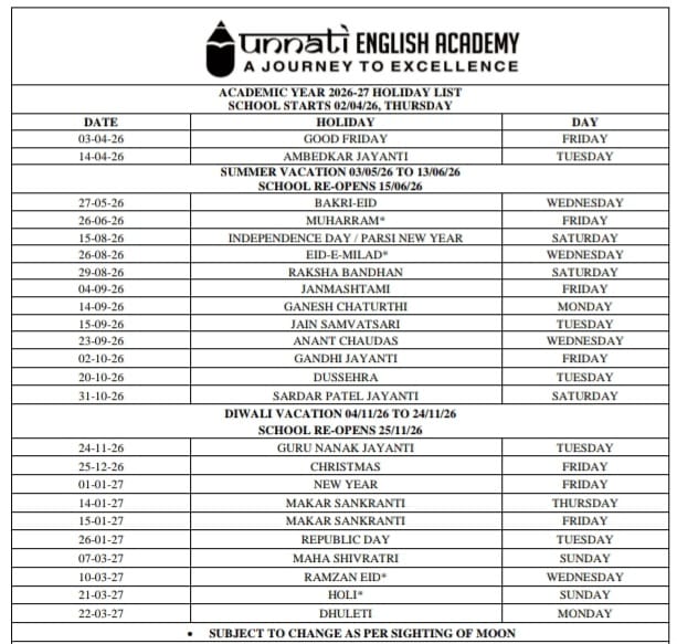 Holiday List 2026 - 27